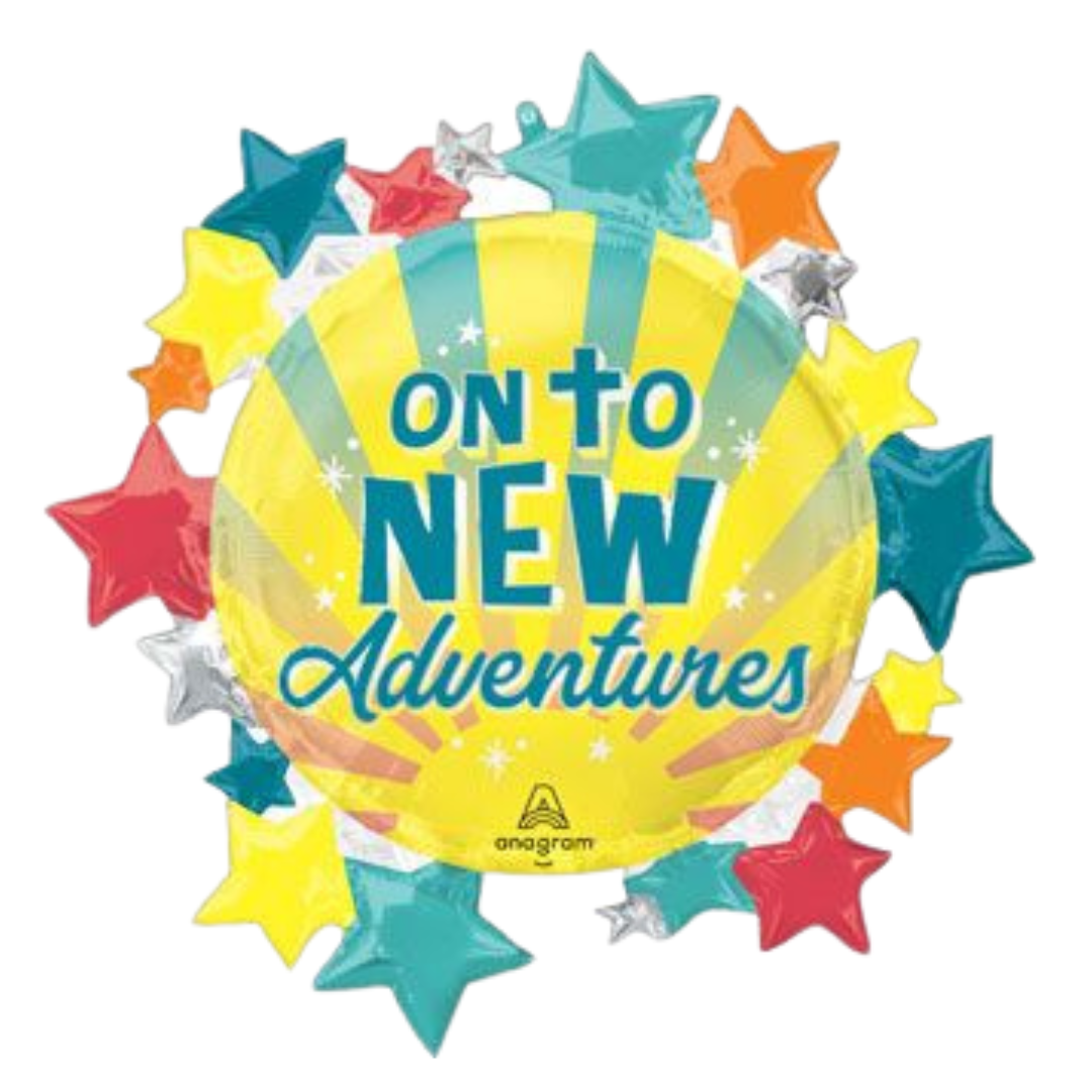 Celebrate every fresh start with this 30" "ON TO NEW ADVENTURES" balloon! Perfect for graduations, moving days, or any exciting new chapter, it adds a burst of fun and optimism to your celebration. Its bold message and eye-catching size make it a cheerful centerpiece that lifts spirits and inspires dreams. Ready to float your next adventure sky-high? This balloon is your playful companion for every joy-filled journey ahead!